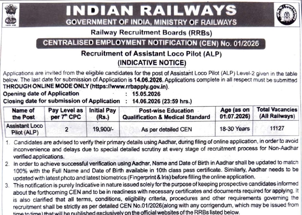 Want to do work in the Railway department then, now you have a great chance to start a career in the Indian railway department with the Posts of ALP 11127 Posts and get selected on the basis of Job requirements. As RRB Railway department is inviting interested candidates for the appointment of Assistant Loco Pilot (ALP) Posts under Railway recruitment cell overall in India. If you possess minimum eligibility (As mentioned Below) then, you can do online registration from the official portal website of RRB Regions i.e www.indianrailways.gov.in (Note: No other Apply Method will be accepted). We are requesting the candidates, they must first go through the official notification PDF & all important detail regarding RRB Railway ALP recruitment 2026.